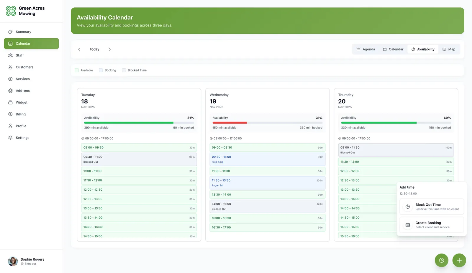 Brand your booking widget with your colours, layout, and style. Add it to any website in seconds and let it handle availability, service selection, and customer details - so bookings roll in even when you’re off the tools.