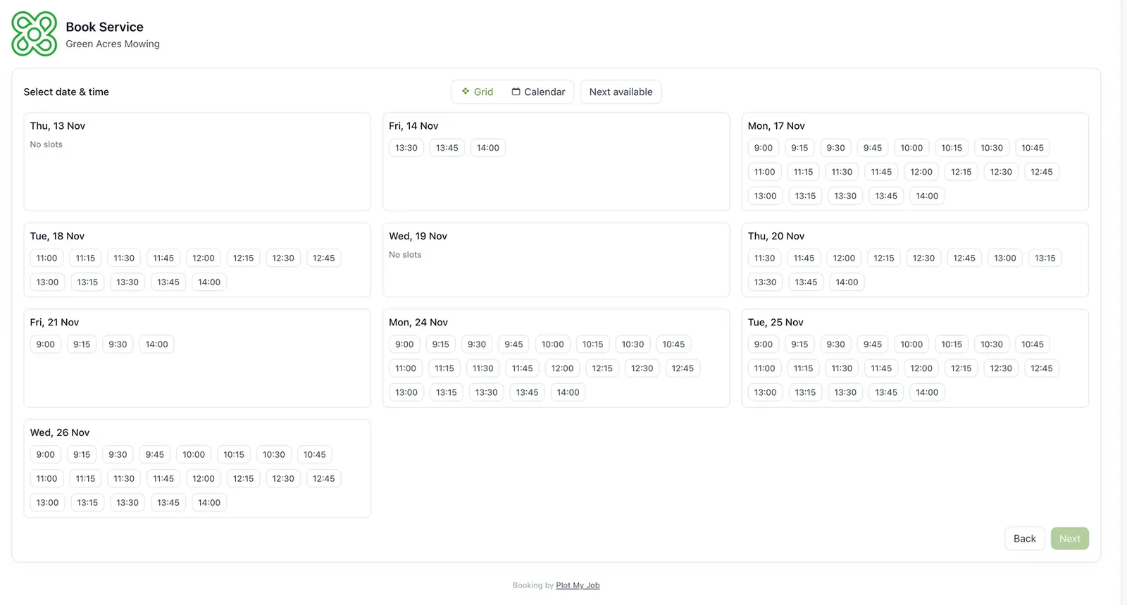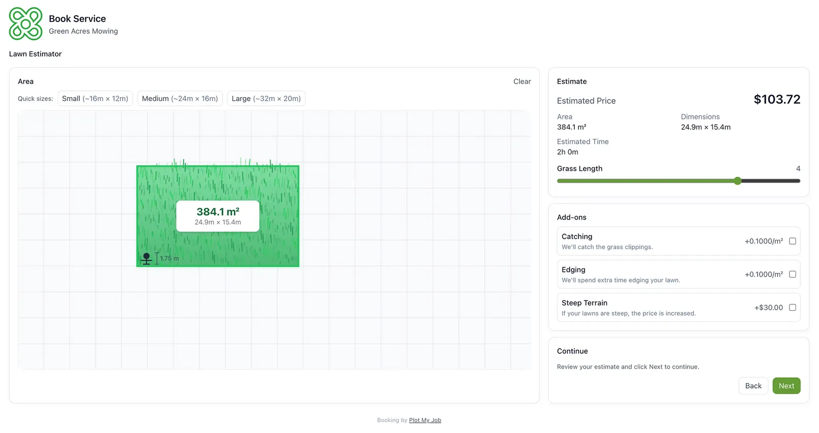 We’ll build you a clean one‑page website and add your Plot My Job booking widget. You only pay for your domain + hosting (hosting is billed yearly, up front).